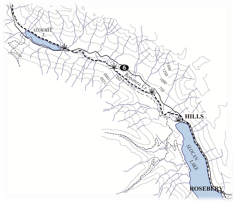The non-motorized rail trail hugs the shorelines of Slocan Lake, Bonanza Creek, and Summit Lake. The south end connects to the Galena Trail in Rosebery, and the north end connects to the Summit Lake-Nakusp rail trail.
